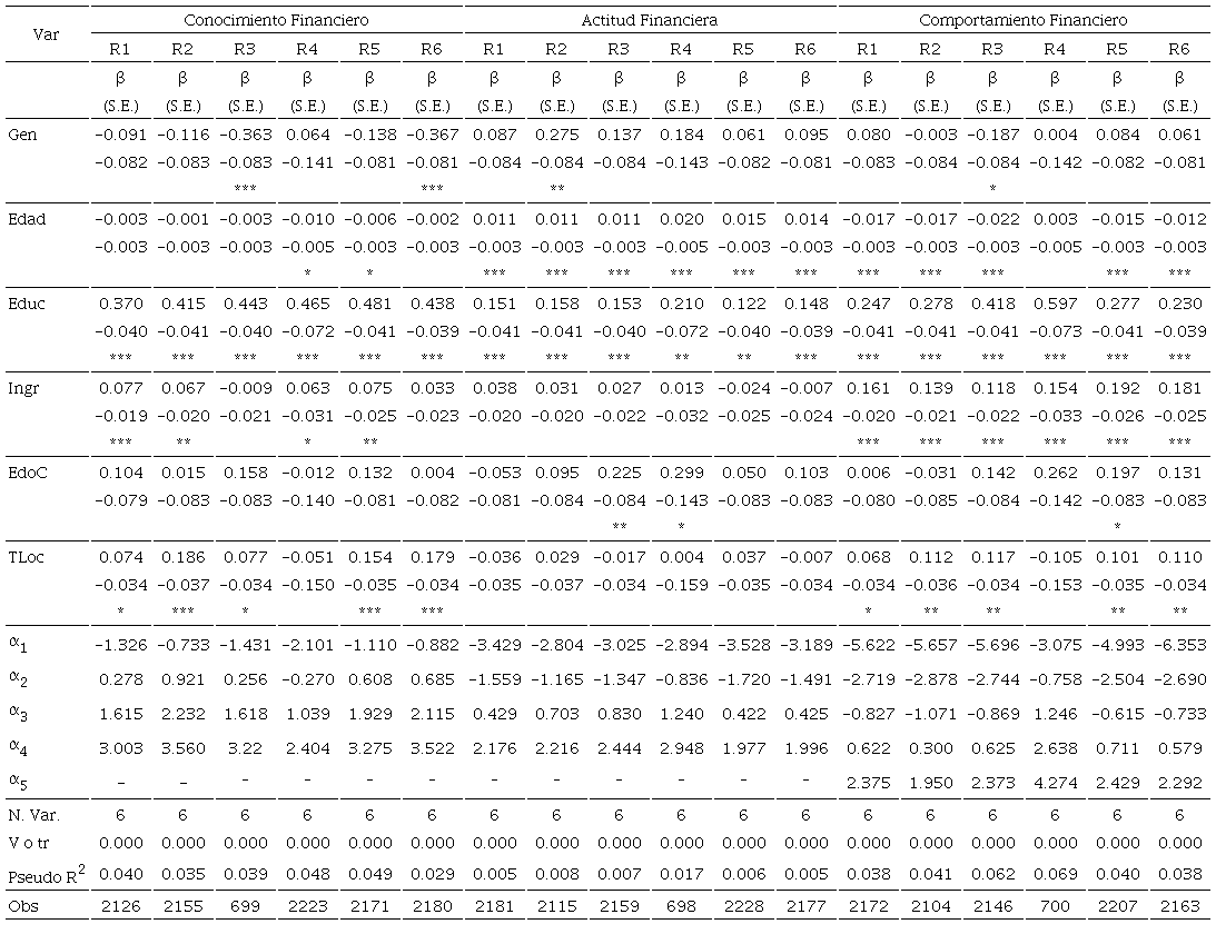 Para analizar las variables dependientes correspondientes a los índices de conocimiento, actitud y comportamiento financiero, por separado, se construyeron modelos logit ordenados. El método de mínimos cuadrados ordinarios no es recomendable cuando la variable dependiente es ordinal (Leckie et al., 2016), en este caso porque la diferencia entre el número de aciertos obtenidos a nivel individual, si bien refleja cierto grado de orden, sólo tiene significado relativo, y porque dos de los tres índices presentan una distribución sesgada.