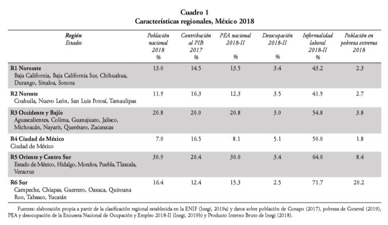 La región Sur (R6) es la de mayor porcentaje de población en pobreza extrema y de informalidad laboral, pero la de menor tasa de desocupación. La región Occidente y Bajío (R3) presenta una tasa de desocupación baja y de informalidad laboral media, en tanto que la Oriente y Centro Sur (R5) es la segunda con mayor tasa de informalidad laboral pero con una desocupación comparable a la de las regiones norteñas.