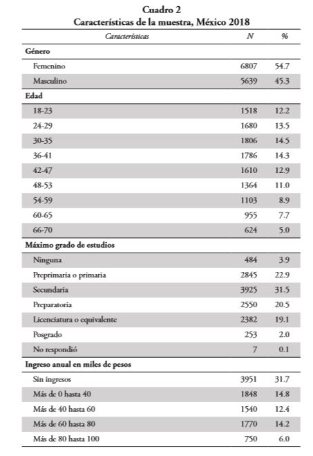 Para esta investigación se analizaron 12,446 registros, 54.7% correspondientes a mujeres y 45.3% a hombres, entre 18 y 70 años de edad, 48.4% residentes en localidades de 100,000 habitantes o más. El número de observaciones por característica de la muestra se puede observar en el Cuadro 2.