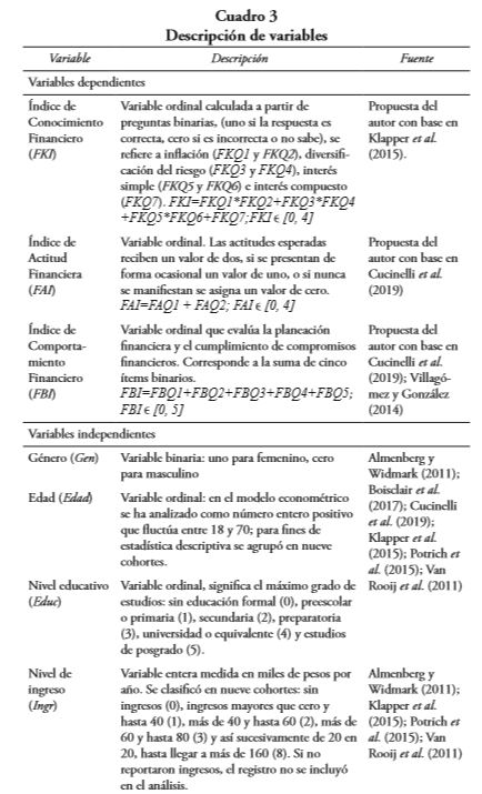 Aunque pareciera natural integrar los tres índices en uno solo, para esta investigación se optó por estudiarlos por separado debido a que evalúan diferentes dimensiones del individuo y a que, en apego al criterio utilizado por Cucinelli et al. (2019) y por Atkinson y Messy (2012), se asumió que su desempeño obedecería de manera distinta al mismo conjunto de variables socioeconómicas.