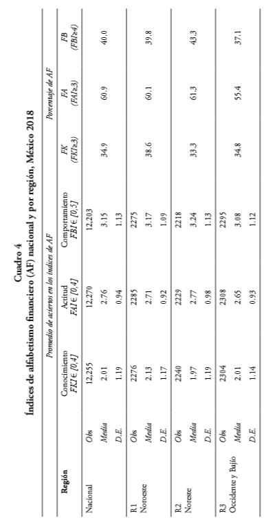 A partir de los resultados de la ENIF 2018 (Inegi, 2019a), Antonio-Anderson et al. (2020) analizaron los factores determinantes del alfabetismo financiero en México. En su estudio incluyeron la variable región, aunque utilizaron un índice general sin distinguir sus componentes. Otros estudios han demostrado que estos componentes pueden variar de manera inversa entre sí, de tal forma que uno podría contrarrestar el efecto de otro (Atkinson y Messy, 2012; Baglioni et al., 2018; Cucinelli et al., 2019).