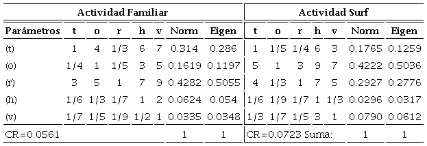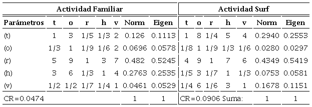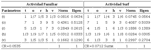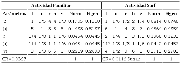 En una segunda etapa, se generan comparaciones con base en el parámetro contra el factor de importancia (10 comparaciones en cada caso). Las Tablas 7, 8, 9 y 10 tienen las matrices pareadas resultantes de las comparaciones realizadas para cada parámetro conforme con el ambiente familiar y actividades de surf. Asimismo, en cada tabla se calculan los pesos mediante el método de normalización y eigenvector. El cálculo de los radios de consistencia de las matrices nos indican el nivel de consistencia de nuestras relaciones definidas en cada caso.
