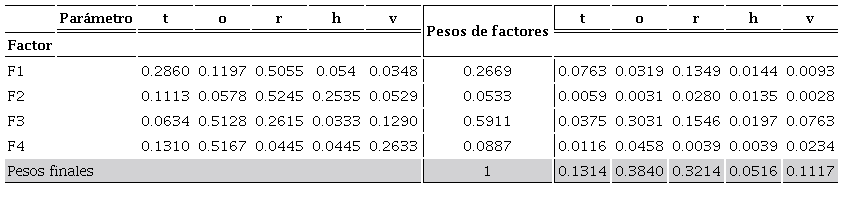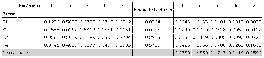 Para obtener los pesos finales de cada parámetro, es necesario combinar todos los resultados obtenidos mediante la multiplicación de los pesos obtenidos para cada factor, por los pesos individuales de cada parámetro y determinados por cada factor. Las Tablas 11 y 12 muestran los valores finales obtenidos por el método de AHP.