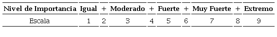 La asignación de pesos dirigida a algún tipo de parámetro no es una tarea clara y suelen asignarse en muchos de los casos de forma discrecional. El Proceso Analítico Jerárquico es una metodología propuesta por Thomas Saaty (2008), que permite crear pesos con base en una asignación subjetiva de importancia entre objetos mediante una tabla de niveles de importancia (Tabla 3). En nuestro caso, permitirá fijar relaciones entre los parámetros de estudio de acuerdo con su impacto en cada factor turístico determinado. El proceso matemático empleado en este trabajo se muestra a continuación.