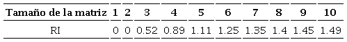 Donde λmax es el máximo eigenvalor de la matriz pareada, n es el tamaño de la matriz, RI es el índice de consistencia aleatoria y CR es el radio de consistencia. El valor de RI depende del número de elementos que se compara, tal y como se muestra en la Tabla 4.