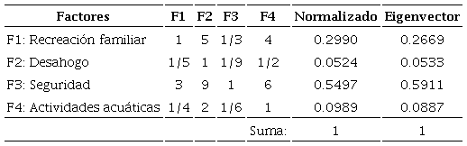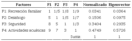 ZOFEMAT encuestó a 50 personas en la localidad del Costa Azul (perfil de surf), mientras que estudiantes del ITES a otros 50 turistas en la Bahía de La Paz (Perfil familiar). Los promedios correspondientes obtenidos por factor, así como por comparación entre parámetros conforme con el factor preponderante, fueron utilizados para construir las matrices pareadas. En este caso los resultados fueron redondeados para obtener los niveles de importancia definidos en la Tabla 3. Un detalle a observar es que tanto las instituciones como las encuestas coincidieron en que la seguridad es primordial en cualquier aspecto para el turista. Sin embargo, se entiende que los surfistas tienen experiencia en nado a mar abierto, por lo que este factor se relaja un poco, derivando en una mayor relevancia una ubicación que permita la actividad de surf dentro de un radio de seguridad. Asimismo, se compararon los resultados obtenidos con el trabajo propuesto por Phillips y House (2009), en donde se realiza un estudio con 50 parámetros involucrados en el análisis de playas turísticas. Al analizar un promedio de los pesos asignados a parámetros involucrados en los factores de estudio, se cumple con un orden de importancia similar a los considerados en este trabajo. Las relaciones de comparación (R) fueron expresadas en un lenguaje coloquial para posteriormente ser traducidas al lenguaje matemático respectivo del AHP. En el caso de una comparación para ambientes familiares, ejemplificamos las siguientes comparaciones: