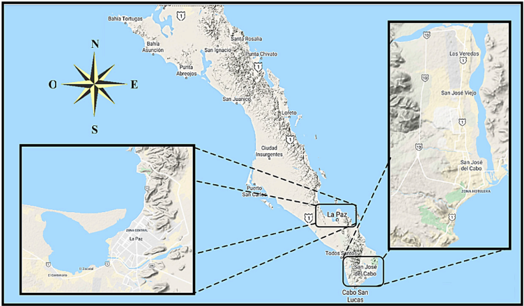 San José del Cabo es una ciudad turística que se ubica en el extremo sur de la Península de Baja California entre los paralelos 23° 01’ y 23° 04’ norte y los meridianos 109° 50’ y 109° 58’ oeste, a 180 km de la ciudad de La Paz, capital del estado (Martínez y Díaz, 2011). Al este de la ciudad se encuentra el Estero de San José, una reserva de la naturaleza con especies de aves, como colibríes, ibis y garzas (Figura 1).