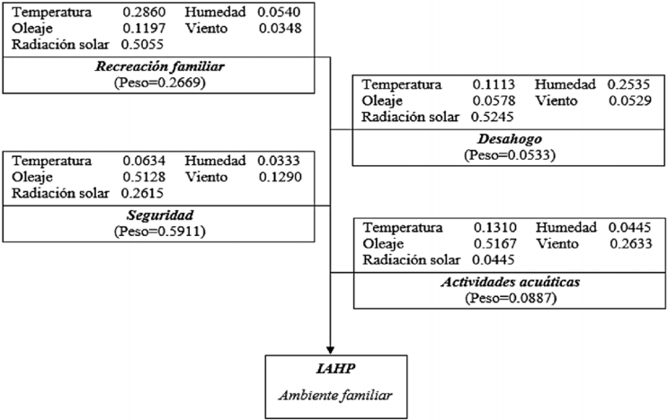 En donde los términos f y s corresponden al ambiente familiar y surf respectivamente. La ecuación 13 será utilizada para evaluar playas cuando el determinante sea tener actividades familiares, por lo que playas tranquilas serán mejor evaluadas. La ecuación 14 se empleará cuando el enfoque sea para realizar actividades de surf, y en este caso las playas de mayor oleaje serán mejor evaluadas. La idea principal es que el turista elija su preferencia y de acuerdo con ello, el indicador correspondiente evaluará qué playa es recomendada de acuerdo con su interés. La Figura 2 muestra el árbol de jerarquías y los pesos calculados para el cálculo del IAHPf.