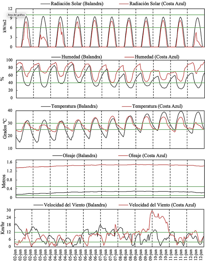 Los parámetros de estudio como la temperatura, radiación solar, velocidad del viento y humedad fueron medidos mediante una estación meteorológica Vantage Vue inalámbrica, la cual consta de varios sensores como un anemómetro, capaz de registrar velocidades de viento desde 3 km/hr hasta 290 km/hr, un colector de lluvia, un sensor de temperatura con rango de medición de -40 °C a 65 °C, un medidor de humedad relativa y un sensor de radiación. El montaje de la estación se realizó en las instalaciones del ZOFEMAT y del CICIMAR, que se encuentran ubicadas en San José del Cabo y La Paz respectivamente. Para la extracción de mediciones de oleaje se emplearon bases de datos proporcionadas por el sitio Windfinder (2019), la cuales tienen una frecuencia de medición de 15 minutos y están disponibles públicamente. Aunque el monitoreo es continuo y automatizado, es necesario analizar un periodo corto para poder observar a detalle el comportamiento de los parámetros y la operación del modelo propuesto. Debido a la sobrecarga de información, 10 días de información fueron evaluadas durante el periodo 2 de junio-12 de junio del 2019 en las playas de La Paz y San José del Cabo, en Baja California Sur. La frecuencia de muestreo se ajustó a 15 minutos por medición durante el periodo, con lo cual se obtuvieron 96 muestras diarias y un total de 1056 muestras por cada parámetro. Esta frecuencia permite observar con precisión el comportamiento de cada parámetro durante el día y a su vez observar momentos ideales durante el día para visita de playa o, por el contrario, qué periodo muestra situaciones no recomendadas.