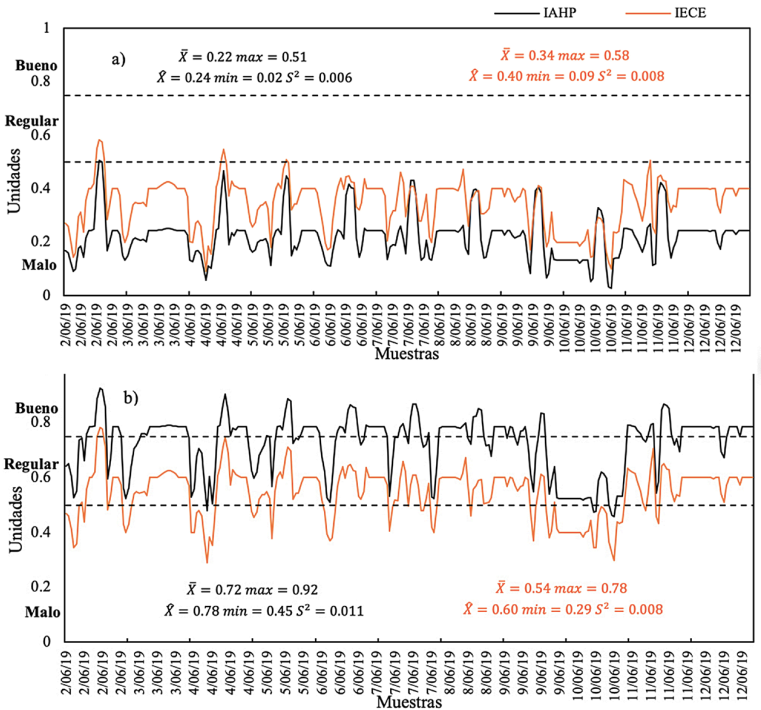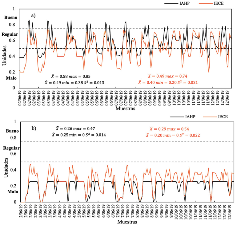 En la Gráfica 3 (b) se muestran los valores obtenidos para la actividad de surf, donde el IAHP muestra un promedio de 0.72, una mejor evaluación respecto a lo obtenido en la bahía de La Paz. Lo anterior sucede debido a que la playa de San José presenta mediciones más altas en el oleaje y la velocidad del viento, que son los parámetros de mayor peso para esta actividad. Por otro lado, el promedio obtenido por el IECE es de 0.54.