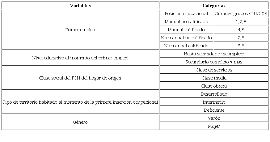 La inserción en el mercado laboral de las distintas clases sociales se vincula al modelo de estratos ocupacionales (Hout, 1983). Con base en esta propuesta, se construyó una variable que diera cuenta de la primera posición ocupacional; ésta plantea jerarquías basadas en la articulación de dos criterios: la caracterización del tipo de empleo (manual/no manual) y el grado de calificación, lo que supone distinciones dentro del grupo de trabajadores, según la posición que ocupan en el proceso de trabajo. La construcción de la variable, fundamentada en la reagrupación de grandes grupos de la Clasificación Internacional Uniforme de Ocupaciones 08 (CIUO 08),3 puede verse en la Tabla 1.