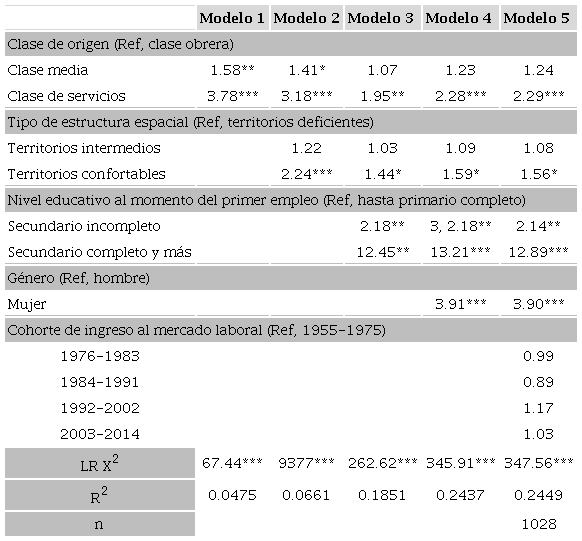 En el segundo bloque se incluye la categorización del territorio habitado al momento del primer empleo, siendo la categoría de contraste la residencia en territorios deficientes. Aún con la incorporación del tipo de territorio, puede verse que el origen de clase continúa estando significativamente asociada a las chances de acceder al mercado laboral. Controlando la posición de origen, habitar territorios confortables aumenta en poco más de dos veces las chances de acceder al mercado laboral a través posiciones no manuales, respecto de las oportunidades de acceso que tienen quienes habitaban territorios deficientes.
