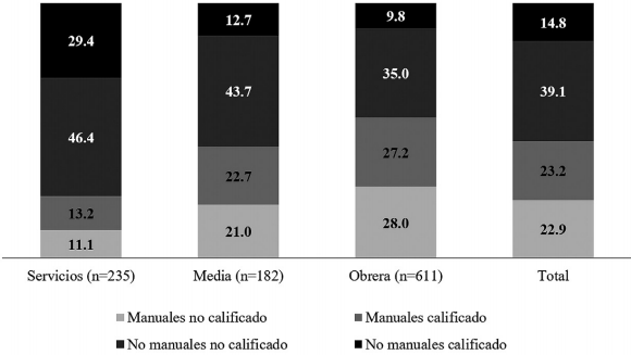 Los constreñimientos impuestos por la posición en clase obrera demarcan la manera en la que sus integrantes acceden a las primeras ocupaciones. Así, 55.2% de las personas que provienen de clase obrera ingresan al mercado laboral a través de posiciones manuales. Estas tendencias disminuyen escalonadamente conforme la posición de clase aumenta, logrando llegar a reducirse a poco menos de la mitad para la clase de servicios. Si bien la posición ocupacional modal para las tres clases se ubica entre posiciones no manuales no calificadas, encontramos amplias diferencias entre clases respecto al resto de las inserciones, sobre todo entre la clase obrera y de servicios.