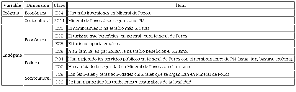 Nombramiento de Pueblo Mágico: esta variable es vista como una variable exógena que ha significado grandes cambios para la localidad, representada con indicadores de inversión y la idea de que Mineral de Pozos continúe siendo PM. Está determinada por dos ítems: la dimensión económica (inversiones en el lugar) y la dimensión sociocultural (seguir como PM).
