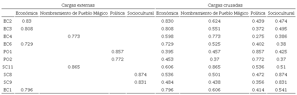 En cuanto a los criterios de la varianza extraída media (AVE), los datos están por encima del criterio mínimo, que es 0.5. Se observa que la variable Económica tiene 0.627, la Política 0.666, el Nombramiento de Pueblo Mágico 0.673 y la Sociocultural 0.727, por lo que se determina que estos constructos tienen una validez convergente.