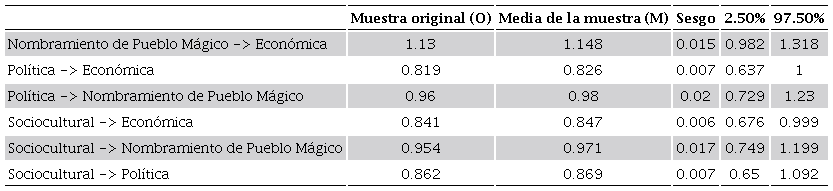 Se consideran los valores de tolerancia por debajo de 0.2 (VIF2° por encima de cinco) en los constructos predictivos como indicativos de colinealidad. Los resultados indican que el constructo denominado Nombramiento de Pueblo Mágico es predictor de la variable Económica, Política y Sociocultural; estos constructos se encuentran por debajo del límite máximo, que es cinco, presentando un valor de uno, por lo que no existe colinealidad (Hair et al., 2019).