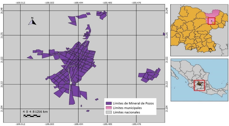 San Pedro de los Pozos es una localidad del municipio de San Luis de la Paz y es mejor conocida como Mineral de Pozos; se localiza en la región noreste del estado mexicano de Guanajuato, específicamente en la subregión Chichimeca (Mapa 1); tiene una superficie de 4782 ha, que representan 2.5% del territorio municipal. Su población es de 2856 habitantes, de los cuales, 1375 son hombres y 1481 mujeres. Además, cuenta con un grado de marginación medio y un grado de rezago social muy bajo (Periódico Oficial de San Luis de la Paz, 2014; IPLANEG, 2018; Sedesol, 2018; Inegi, 2020).