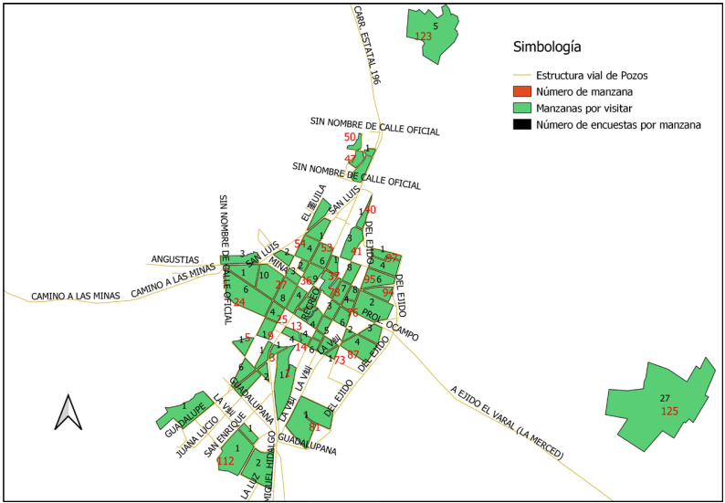 Posteriormente, durante las visitas de campo se observó el territorio y, por las características encontradas, se decidió realizar el levantamiento de encuestas por manzana, que resultó ser la mejor forma de abordar toda la localidad de manera ordenada para hacer más eficiente este proceso. Además, se hizo una corrección de la muestra para población finita para la aplicación de encuestas en campo, con el siguiente procedimiento: se eliminaron las manzanas que no tenían viviendas habitadas y aquellas que sólo contaban con una vivienda habitada, obteniendo al final 57 para la aplicación de las encuestas. Se seleccionó el número de encuestas a aplicar en cada manzana, de acuerdo con la proporción de éstas con respecto al total, y se procedió a mapearlo.