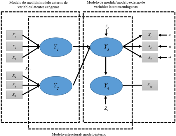Un nomograma (modelo path) PLS está integrado por dos elementos: un modelo estructural (modelo interno) y los modelos de medida (modelos externos) de los constructos, los cuales reflejan las relaciones entre estos constructos y las variables indicador (rectángulos). Estos nomogramas (modelos path) se dibujan con base en la teoría seleccionada, entendiendo como teoría el conjunto de hipótesis relacionadas sistemáticamente, desarrolladas mediante el método científico y que se pueden utilizar para explicar y predecir resultados (Hair et al., 2019).
