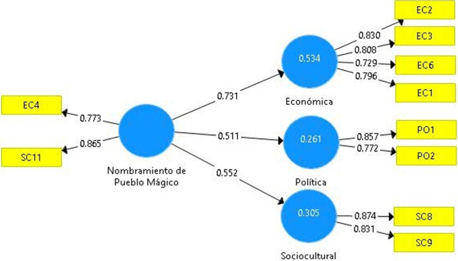 Se observa que, para la dimensión Económica, el valor es de 0.713, lo que hace que esta relación sea la más significativa con la variable endógena del Nombramiento de Pueblo Mágico; por su parte, la variable Política tiene un valor de 0.511; mientras que la variable Sociocultural un valor de 0.552; ambos también presentan resultados significativos (Hair et al., 2019).