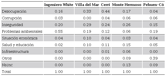Comparando los resultados, se advierten diferencias importantes entre las localidades, como puede verse en la Tabla 1. Se evidencia que la preocupación por lo ambiental es mucho más significativa en Ingeniero White que en el resto de las localidades. Como se ha señalado, el Polo Petroquímico es aledaño a esta localidad y de allí que es frecuente el olor a químicos y gases, además de la contaminación sonora que es causada por las plantas industriales.