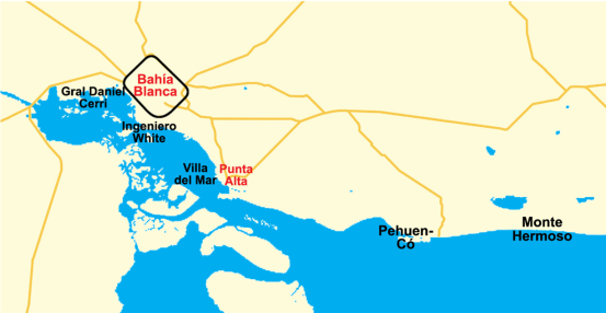 El escenario de nuestro estudio es el estuario de Bahía Blanca. Es el segundo más grande de la Argentina y contiene cinco puertos a lo largo de los 60 km de su canal principal. Se encuentra en el sudoeste de la Provincia de Buenos Aires. En su margen, en dirección oeste-este, se ubican sucesivamente las localidades de General Daniel Cerri (Cerri, de aquí en adelante), Ingeniero White, Villa del Mar, Pehuen-Có y Monte Hermoso. Las características sociales y económicas de las dos últimas localidades ubicadas fuera del estuario difieren en mayor medida de las primeras tres. Ingeniero White y Cerri están mayormente habitadas por obreros, trabajadores portuarios y pescadores, y son las más expuestas a la contaminación del aire, el agua y auditiva, dado que en la misma región se emplaza el Polo Petroquímico de Bahía Blanca.3
