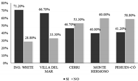 Con respecto a si en la última década el encuestado había notado cambios ambientales en su localidad, la respuesta afirmativa fue más significativa en las localidades cercanas a los puertos y al Polo Petroquímico, es decir, en aquellas localidades mayormente expuestas a los factores antropogénicos, como se observa en la Figura 2.