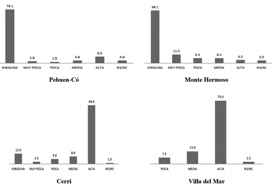 Por otra parte, uno de los puntos de la encuesta es la participación de los encuestados en organizaciones o grupos ambientalistas. En este caso, existen diferencias entre localidades. Si bien las representaciones con respecto a los cambios en el ambiente antes analizadas señalarían que la preocupación ambiental existe, en estas poblaciones no parece haber una participación significativa en organizaciones o movimientos proecológicos. En casi todas las localidades, la participación osciló entre 10% y 17%, salvo en el caso de Villa del Mar, donde alcanza 32% de participación.