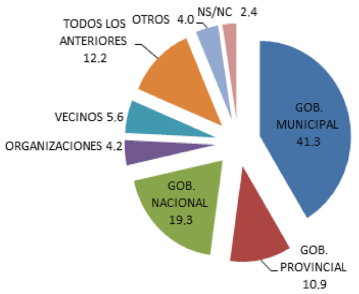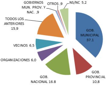 Según puede observarse en las Figuras anteriores todas las localidades, en mayor o menor medida, señalaron al Estado (nacional, provincial o municipal) como el actor que debería responsabilizarse por la cuestión ambiental. Sólo para un número que ronda 10 a 12% de los encuestados son los propios vecinos y las organizaciones sociales quienes deben hacerse cargo de los problemas ambientales. Aquí aparece lo que Cerrillo Vidal (2010) denominó “gap ambiental”. Las personas tienen una cierta conciencia ambiental, que se pone de manifiesto en sus respuestas anteriores, pero cuentan con que algún tercero (ni ellos ni el emisor) debería ocuparse del tema.