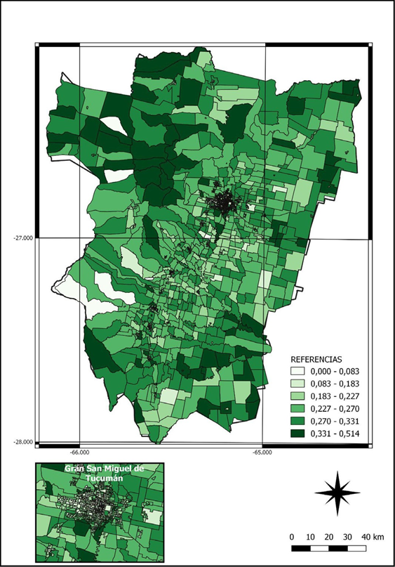 Tomando como fuente de información las bases del Censo Nacional de Población, Hogares y Viviendas del año 2010, pretendemos una aproximación a partir de las siguientes variables a la vulnerabilidad alimentaria en Tucumán. Cada una de las variables seleccionadas tuvo un peso ponderal específico en la sumatoria que da lugar al IVAL (Tabla 1). Este tipo de agrupación fue una forma de organización óptima de la información de acuerdo con la similitud existente entre las variables y la finalidad del indicador. No obstante, la escala de análisis y el uso de un enfoque ecológico2 impiden atender a dichas particularidades. Proponemos, por tanto, utilizar el IVAL como una herramienta de aproximación a la distribución espacial del problema y la identificación de diferentes territorios.