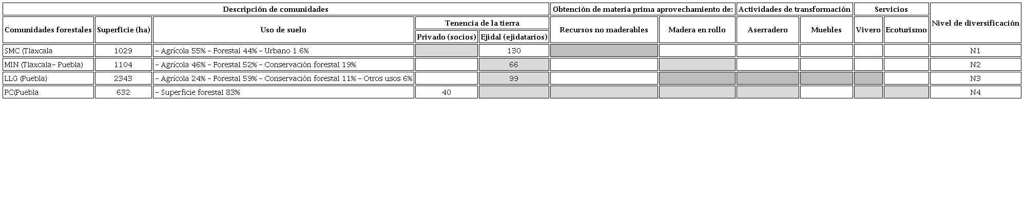 Este trabajo analiza las comunidades Santa María de las Cuevas (N1), Las Minillas (N2), Llano Grande (N3) y Piedra Canteada (N4), localizadas en Puebla y Tlaxcala. Las EFC seleccionadas presentan modelos organizativos contrastantes (en el nivel de integración de cada EFC y el grado de autonomía) y distintos niveles de diversificación e integración vertical de las actividades económicas (Tabla 1). Estas EFC se pueden homologar a la clasificación del Proyecto de Conservación y Manejo Sustentable de Recursos Forestales (Procymaf), que distingue cuatro tipos de productores en función de su grado de integración vertical (Conafor, 2013) (Tabla 1), lo que permitirá analizar cualitativa y comparativamente los criterios que limitan y fomentan el desarrollo exitoso de las EFC estudiadas en la región y entender cómo podrían escalar su economía a nivel regional.
