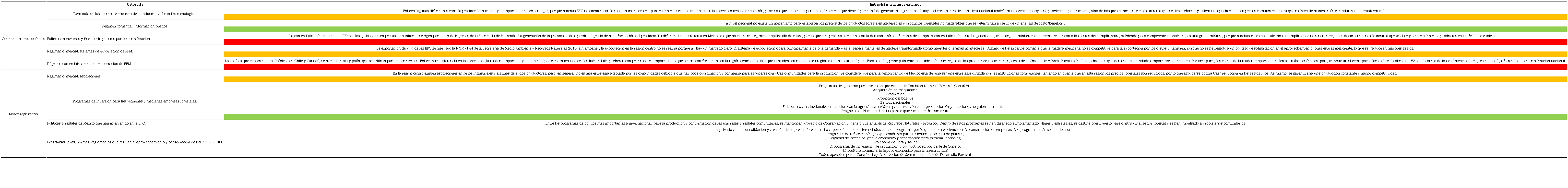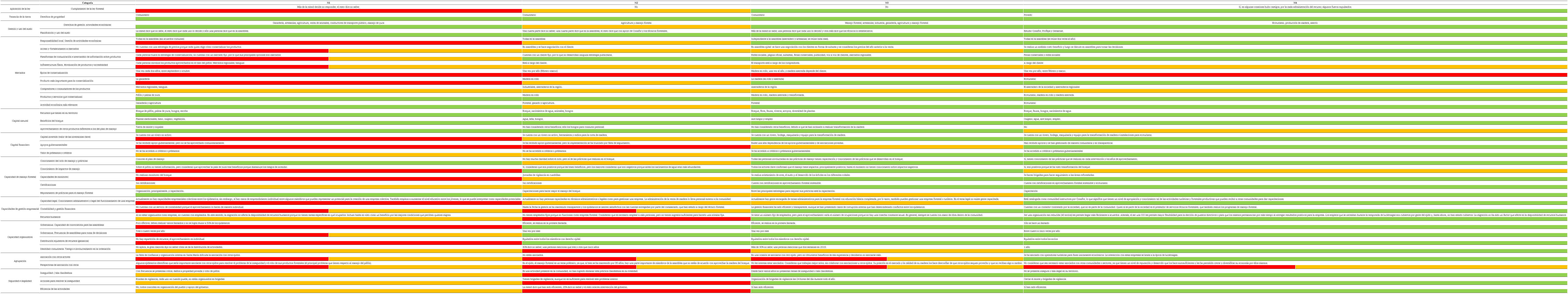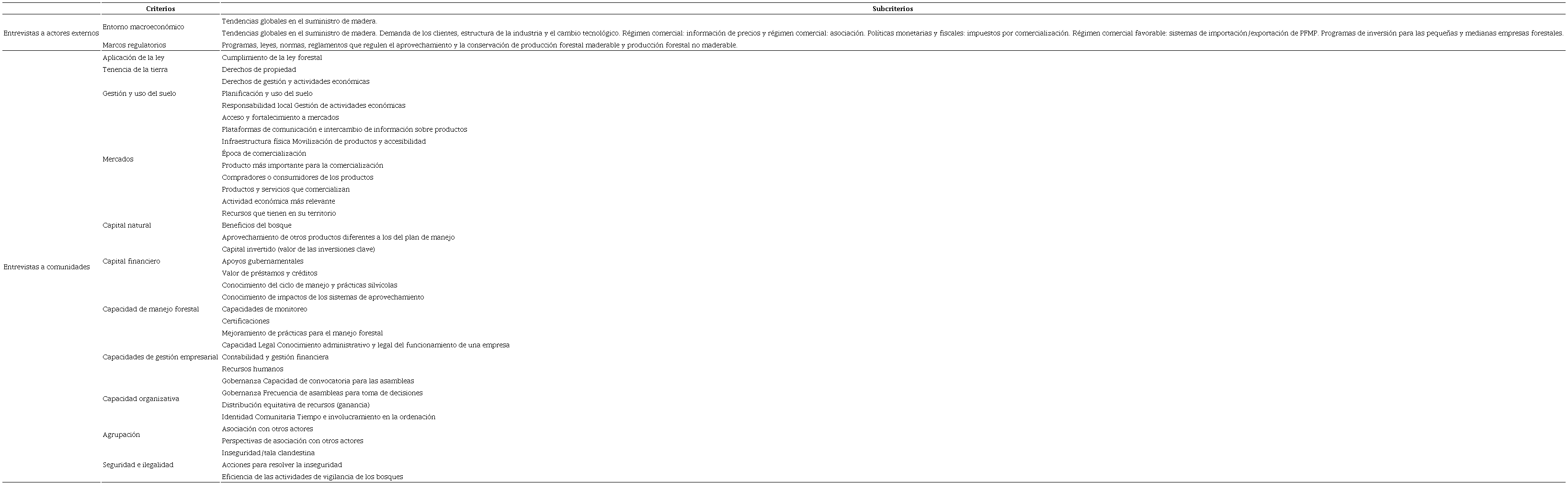 La capacidad de escalamiento se evalúo a partir de 12 factores para un entorno empresarial propicio para las EFC, con base en el marco teórico de Sanchez Badini et al. (2018), a los que se agregó el criterio contextual “seguridad e ilegalidad”, debido a que recurrentemente fue abordado por los informantes (Tabla 2). La identificación de oportunidades y obstáculos de las EFC para el escalamiento regional se realizó con criterios cualitativos (Eisendhardt, 1989; Yin, 2003; Ritchie et al., 2013), a partir de entrevistas y talleres con actores clave (líderes de las comunidades que desempeñan labores directas en el EFC y que participan de la toma de decisiones; académicos y funcionarios gubernamentales especialistas en el sector de la región), seleccionados por medio del método bola de nieve (Ritchie et al., 2013). Las entrevistas semiestructuradas a líderes locales permitieron explorar la historia de la conformación de cada EFC, la percepción sobre limitaciones y oportunidades para lograr el escalamiento y el autorreconocimiento de sus capacidades de organización, a través de los siguientes temas: historia del ejido, organización interna, capacidades de agrupación, empresa forestal, capacidad de gestión, mercado, capital natural y financiero y capacidades de manejo forestal.