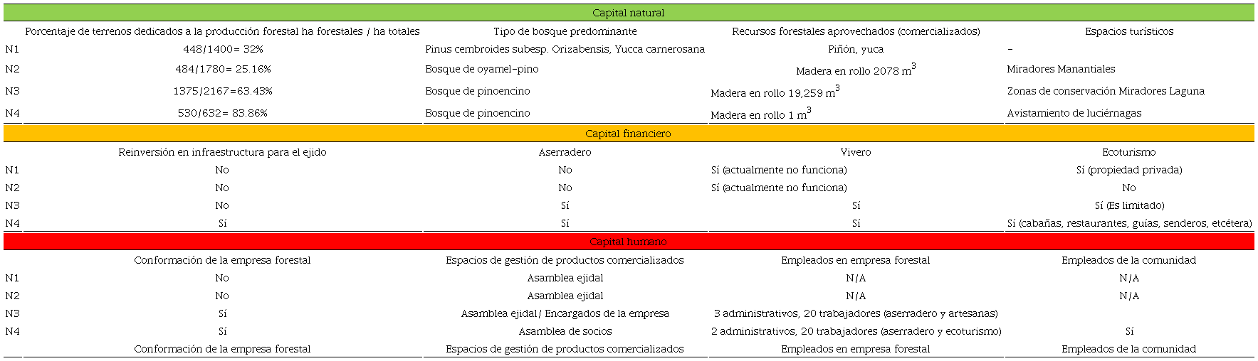 El capital natural se analizó a través de los recursos aprovechados y los beneficios identificados por la comunidad en el aprovechamiento. En N1 se aprovecha el piñón en años semilleros; la palma tiene su propio programa de manejo y se aprovecha anualmente, pero con escaso retorno económico. La baja productividad de los bosques del ejido no permite el aprovechamiento de la madera en rollo (Tabla 5). Para N2, N3 y N4, el tipo de bosque predominante es adecuado para el aprovechamiento de madera en rollo (Tabla 5). A pesar de que en N2 tienen identificado su capital natural, no visualizan alternativas de aprovechamiento y diversificación (de madera o productos forestales no maderables) debido a la baja accesibilidad a los mercados más inmediatos. Sin embargo, identifican lugares potenciales para el ecoturismo, como manantiales y miradores. A pesar de la diversidad de los bosques, sólo hay un aprovechamiento de la madera en rollo (se extraen anualmente un volumen estimado de 2078 m3), pero en N3 la producción anual es casi 10 veces mayor a N2 (Tabla 5).