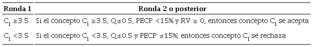 Teniendo en cuenta la técnica Delphi, y a fin de llegar a un consenso sobre la concomitancia de los aspectos socioecológicos relacionados con el sistema maíz de temporal, se realizaron dos rondas anónimas de forma remota y tres reuniones presenciales del equipo de trabajo de coordinación pertenecientes al Instituto Interamericano de Tecnología y Ciencias del Agua (IITCA). La primera ronda constó de preguntas abiertas y cerradas. Los expertos asignaron un grado de acuerdo en escala Likert de cinco categorías (desacuerdo o acuerdo). El esquema se planteó de forma mensual, donde los expertos propusieran conceptos y dimensiones. Adicionalmente, los expertos participaron en un proceso de lluvia de ideas referente al concepto y alcance de la sostenibilidad. En este tema, la encuesta requirió una ronda adicional, ya que la primera no se consideró en el proceso de calificación. Al final de las primeras rondas se calculó, para cada concepto: puntación media de las calificaciones (Ci), desviación estándar (DE) y rango intercuartil (Q). Para rondas sucesivas se calculó la proporción de expertos que cambian sus calificaciones (PECP) y la proporción de reducción de variabilidad (RV) (Tabla 1). Chu y Hwang (2008) mencionan que el requisito mínimo para llegar a un consenso sobre un aspecto específico durante la segunda ronda, o posterior, se establece en 75 por ciento.