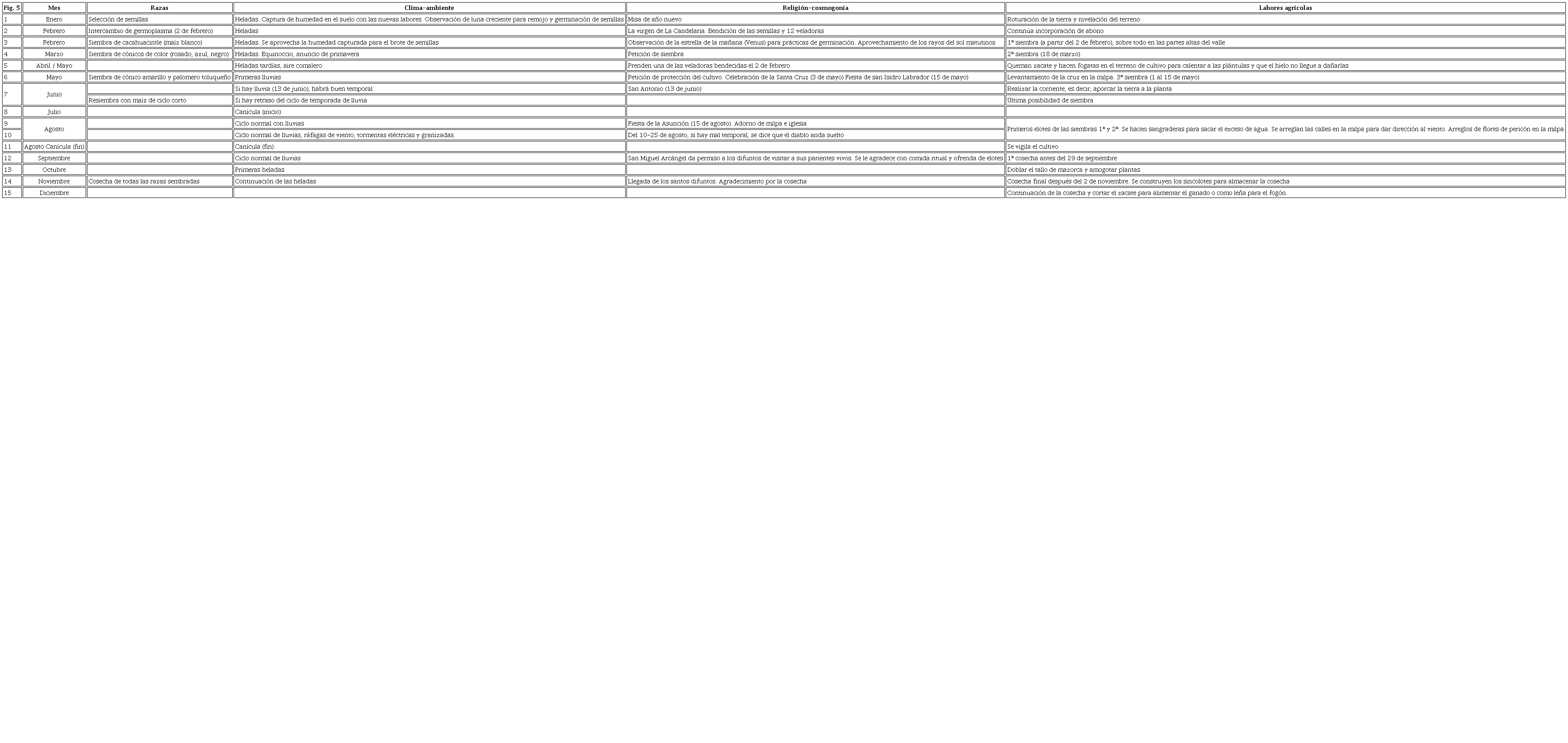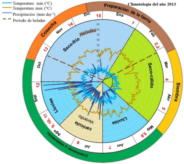 La climatología se caracterizó a partir de los registros del periodo 1985-2016, considerando una precipitación media anual de 839 mm (±123), temperatura máxima y mínima anual promedio de 20.6 °C (±0.5) y 6.6 °C (±0.9), respectivamente. Si bien el análisis de variabilidad climática muestra que en la región las precipitaciones se han incrementado y las temperaturas se han vuelto más extremas, surgió la necesidad de esquematizar el comportamiento del clima de forma general. En la Figura 5 se detallan las conexiones que envuelven el binomio campesino-maíz, con base en las variaciones temporales del año 2013. La precipitación anual fue de 873 mm; más de 70% de las lluvias ocurrieron entre junio y septiembre, siendo febrero y marzo los meses más secos. La temperatura mínima promedio fue de 8°C; de noviembre a febrero se presentaron temperaturas próximas a 0°C, y en marzo por debajo de los 0°C; asimismo, la ocurrencia de heladas fue de octubre a febrero. La temperatura máxima promedio fue de 21.4°C, aunque de abril a junio se presentaron temperaturas de 27°. En la Tabla 3 se sintetizan las principales relaciones entre maíz, clima, religión y labores agrícolas de los campesinos de la zona.