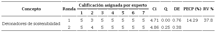 El proceso de identificación de detonadores de sostenibilidad se basó en el modelo multidimensional construido (Figura 5 y Tabla 3) y en un proceso de consenso de expertos a partir del método Delphi (Tabla 4).