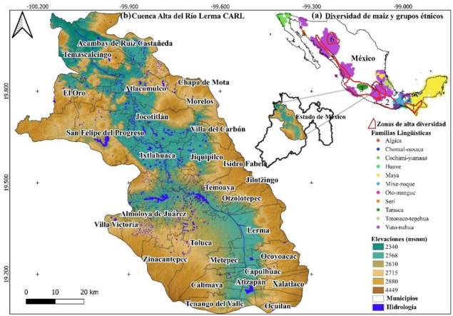 La región es única por las ciénagas de Lerma (Chignahuapan, Chimaliapan y Chiconahuapan) y el volcán Nevado de Toluca. Los abundantes manantiales y toda su hidrología (Figura 1, sección b) hicieron de esta cuenca un sitio atractivo para asentarse. Los grupos étnicos de la región practicaban el cultivo intensivo en humedales, así como la agricultura de temporal (milpa) en el sistema de bancales y terrazas en las laderas de las montañas (Metcalfe et al., 1989).