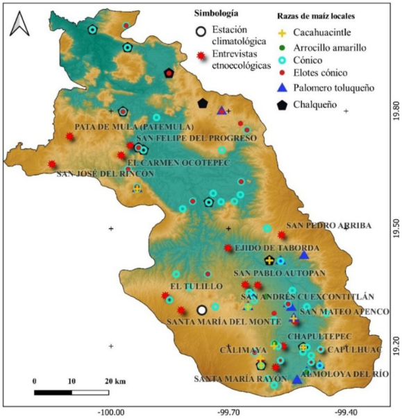 El conocimiento local campesino sobre el cultivo del maíz se analizó mediante consulta de escritos etnohistóricos y entrevistas etnoecológicas. La caracterización de la climatología y su relación con el cultivo de maíz se basó en datos climatológicos del periodo 1984-2016, a partir de los registros diarios y mensuales de la estación San Francisco Tlalcilalcalpan (19.292° N, -99.768° W) (Conagua, 2020).