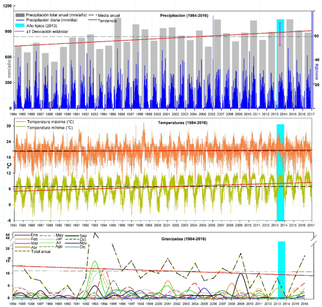 Los registros de temperatura muestran poca variación, sin embargo, se observa que la temperatura mínima presenta incremento, por lo que las noches y madrugadas son un poco más cálidas a partir del 2001. En cuanto a la ocurrencia de granizadas, se observa que en promedio ocurren 11 por año, aunque en 1993 se registraron 46. Las granizadas son más comunes entre mayo y septiembre, siendo junio el más severo. Durante el periodo de análisis se observa que las granizadas se han intensificado en agosto. Cabe destacar que estos resultados son congruentes con los reportados por Mastachi-Loza et al . (2016), quienes identificaron que la precipitación, las granizadas y las temperaturas se han incrementado, pues son más extremas y presentan desfase en su comportamiento histórico normal (1960-2010).