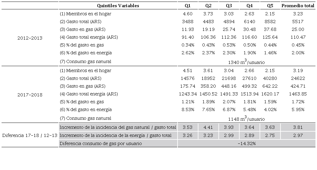 Estos conjuntos de datos fueron procesados mediante el programa Access y planillas de cálculo construidas ad hoc . Cabe señalar que la ENGHo utiliza una muestra de hogares ubicados en centros urbanos de 2000 o más habitantes y, además, utiliza factores de expansión por hogar para reconstruir el universo de análisis. Por su parte, la base de Enargas utiliza valores absolutos para informar el gas distribuido y la cantidad de usuarios. A partir de ambas bases de datos se calculó el promedio nacional y el promedio por quintil de ingreso per cápita, tanto para 2012-2013 como para 2017-2018, de los siguientes indicadores: (1) cantidad de miembros por hogar, (2) gasto total promedio por hogar (ARS), (3) gasto promedio destinado a gas natural por hogar (ARS), (4) gasto promedio destinado a todos los energéticos por hogar (ARS), (5) peso del gas natural sobre el gasto total (%) y (6) peso de todos los energéticos sobre el gasto total (electricidad, gas natural y combustibles a granel). Asimismo, a partir de los datos operativos Enargas (2020b) se obtuvo el promedio nacional del (7) consumo de gas natural por usuario residencial.