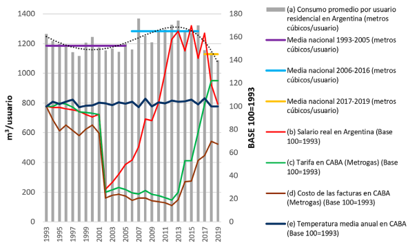 En la Gráfica 1 se verifica, entre 1993-2019, la evolución de (a) el consumo promedio de gas natural por usuario residencial en Argentina (Enargas, 2020b), (b) el salario real en Argentina (IERAL, 2020); (c) la tarifa en CABA (Metrogas) (Arceo, 2019), (d) el costo de las facturas en CABA (Metrogas) ―considerando tarifa (Arceo, 2019) y consumo (Enargas, 2020b)― y (e) la temperatura media anual en CABA (DGEyC, 2022).
