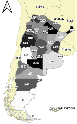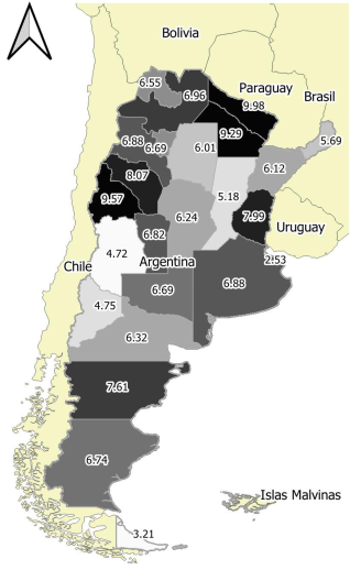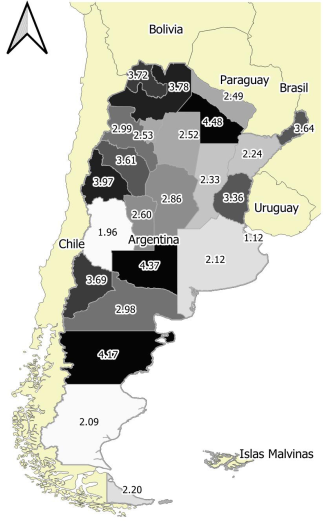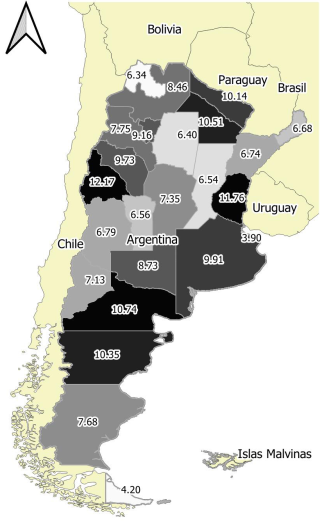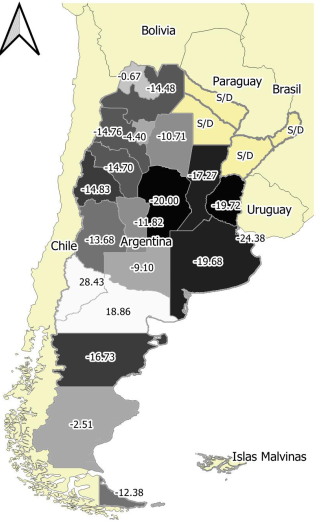 A continuación se propone un análisis de lo sucedido en las diferentes provincias entre 2012-2013 y 2017-2018. Para ello, en primer lugar, se incorpora un mapa de Argentina (Figura 1), donde se observan las diferentes provincias y la temperatura media anual, con el objetivo de contar con una caracterización inicial del caso de estudio. A su vez, la Figura 2 muestra la variación porcentual en el consumo promedio de gas natural entre 2012-2013 y 2017-2018.