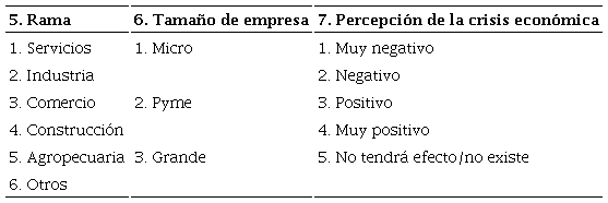 Las variables estructurales consideradas fueron la rama económica, el tamaño de la empresa donde laboran las personas y el impacto que consideran que el covid-19 ha tenido en su economía; este grupo de variables indican la composición estructural y características del mercado de trabajo en el que se encuentran ocupados (Tabla 2).