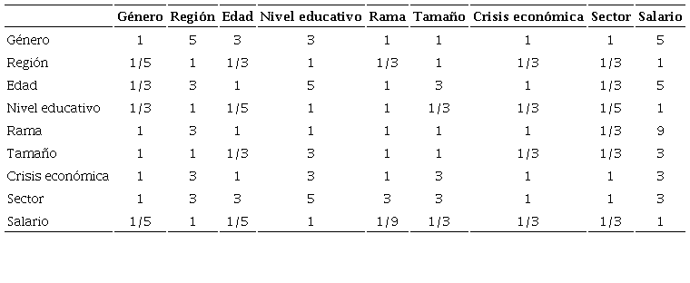 Posteriormente, se construyó la matriz de comparaciones, que en este trabajo es de dimensión 9x9, ya que se están considerando nueve variables o criterios de evaluación. Se normaliza dicha matriz por columnas y se promedia por filas para obtener el vector de pesos por variable (Saaty, 2003).