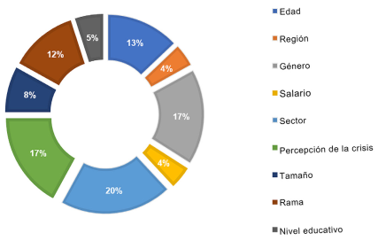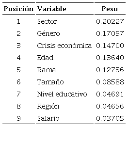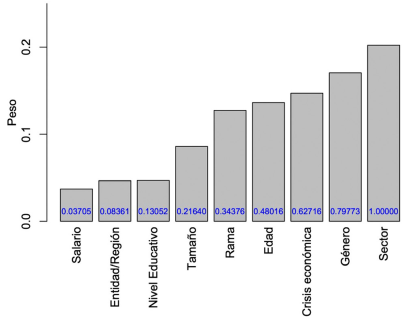 Como se observa, la variable Sector es la que mayor peso obtuvo, seguida del Género; las que menor peso obtuvieron fueron el Salario y la Región, dichos resultados son consistentes con datos sobre los estudios realizados por el Instituto Mexicano para la Competitividad (Imco, 2020), donde se menciona que el sector informal ha sido el más afectado por el desempleo. La OIT (2020a) señala que la ocupación informal (en sectores formal e informal) tuvo una baja histórica de 47.7 por ciento.