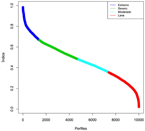 Se generaron 10,000 perfiles aleatorios considerando la metodología antes propuesta y se realizó un análisis de clúster para identificar a los más vulnerables. Mediante este análisis se clasificaron en cuatro grupos o conglomerados, de acuerdo con el grado de vulnerabilidad: leve, moderado, severo y extremo (Gráfica 3).