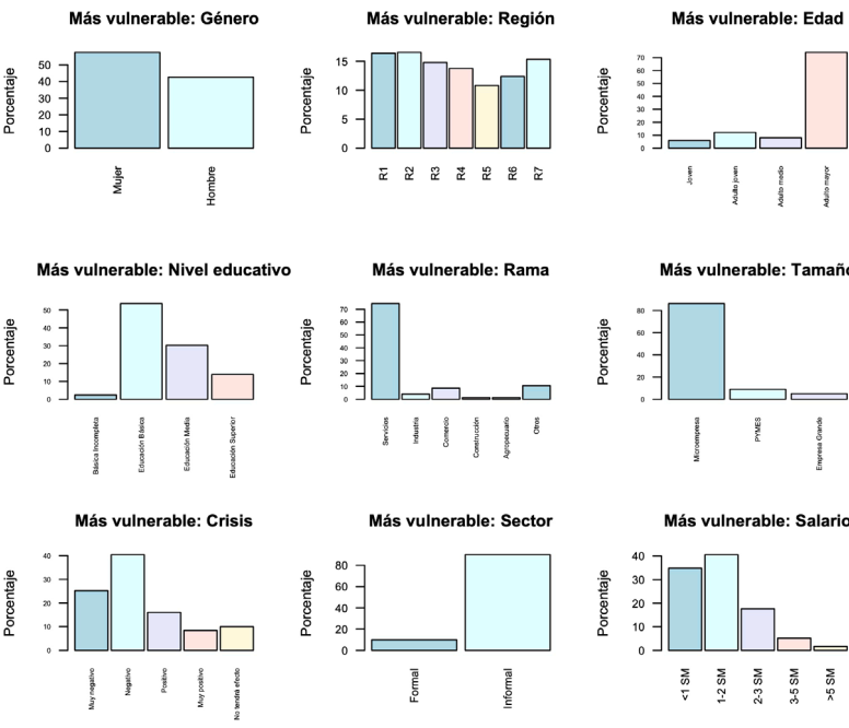 Notemos que los ocupados en microempresas informales de la rama de servicios tienen una propensión ligeramente mayor a afectar a las mujeres y ocupados mayores con educación básica, y que, aunque hay cierta vulnerabilidad por regiones y nivel de salario, estas características son marginalmente importantes en el IVD.
