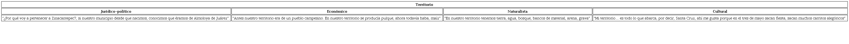 El territorio es el espacio en el que los seres humanos nos relacionamos, donde nos unimos o confrontamos, al cual se le otorga un sentido de pertenencia e identidad que, ante contextos de conflicto, se promueve la asociación de actores capaces de proceder colectivamente para defenderlo, pues comprenden que en la defensa del territorio está implícita la salvaguardia de su modo de vida (Hernández Flores et al., 2013).
