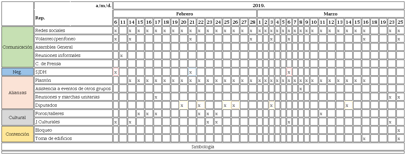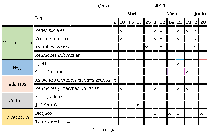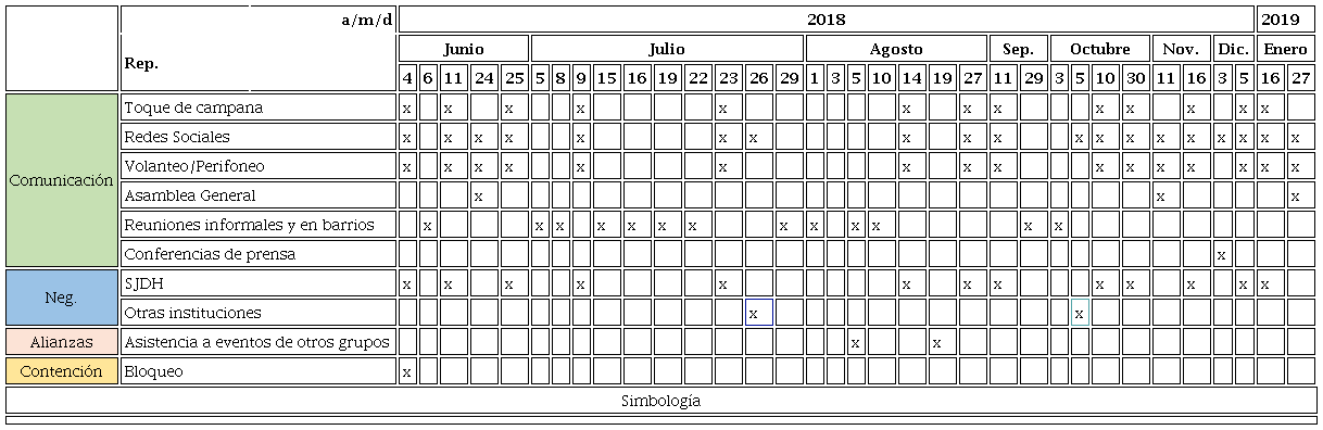 Posteriormente se concretó una reunión con la SJDH el 11 de junio de 2018, en donde se expuso ante el secretario de Justicia, el director de Legalización, el Periódico Oficial Gaceta de Gobierno y el subsecretario de Gobierno del Valle de Toluca, la situación del conflicto, así como su solicitud para sostener una audiencia con el gobernador del Estado. Desde este momento, la movilización del grupo fue una constante, en total se llevaron a cabo 14 acciones colectivas (manifestaciones, acciones de comunicación y reuniones, entre otras) (Tabla 2), que corresponde al mismo número de encuentros entre disidentes y funcionarios del gobierno en Toluca.