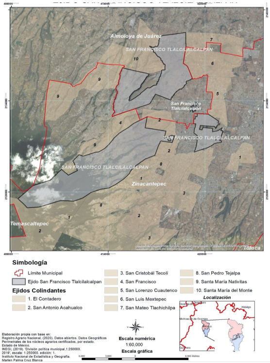 San Francisco Tlalcilalcalpan es una comunidad que pertenece al municipio de Almoloya de Juárez, en el Estado de México. Asentado entre una llanura y un lomerío, San Francisco se caracteriza por tener suelo de tipo andosol y vertisol en donde se practica la agricultura de temporal anual (Martínez Álvarez y Vicencio Carballo, 1998). De acuerdo con datos consultados a partir del 2018 en el Sistema Padrón e Historia de Núcleos Agrarios (PHINA), San Francisco posee un total de 3414.29 hectáreas de tierra, que la hace ser la comunidad con la superficie ejidal más grande del municipio, de ellas, se destinan 1687.02 hectáreas para tierras de uso común, se trata de una área boscosa en donde abundan árboles de pino, encino y oyamel, es lugar de recarga para mantos acuíferos y ojos de agua, además es zona de extracción de recursos forestales no maderables como leña, hongos, musgo y tierra de monte. Actualmente, el ejido se encuentra bajo la posesión de 766 ejidatarios.